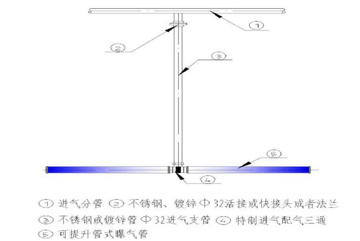 每根进气分管要从池岸上的总管分布出来,由法兰或油任连接,靠池壁弯至池内水位液面处。曝气器悬挂安装离池底约150~500mm,也可根据设计要求。