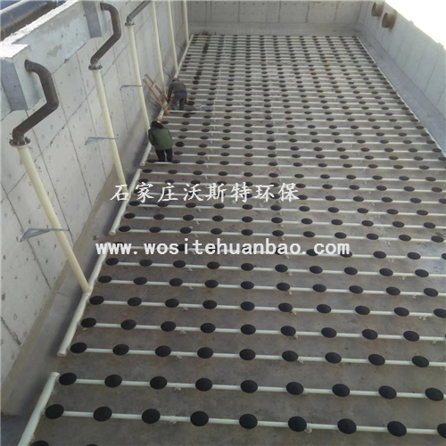 在曝气系统中最主要的是空气扩散器也称为曝气器。空压机将空气通过一系列管道输送到安装在池底部的空气扩散装置,经过扩散装置,使空气形成不同尺寸的气泡。气泡在扩散装置出口出形成,尺寸则取决于空气扩散装置的形式,气泡经过上升和随水循环流动,最后在液面处破裂,在这一过程中产生氧向混合液中转移的作用。