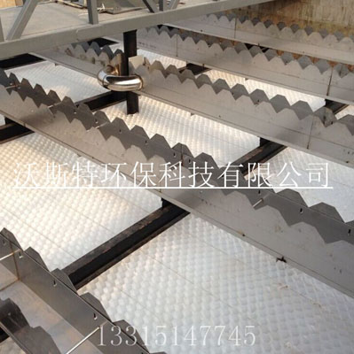 斜管填料在沉淀池内安装时支架上部自左向右进行组装。始终保持60°角不变,每一单元顺序组装时要适当压紧,组装到右侧时若尺寸不是正合适,需要根据尺寸用散片斜管填料烫接后进行组装直至全部到位。
