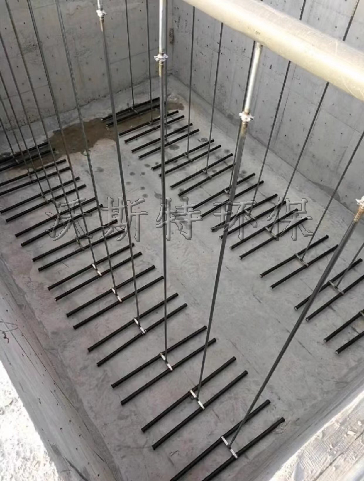 悬挂提升曝气管主要采用主干管沿池壁一侧上方横向布置,次干管与主干管垂直,架空干池顶,依次排列。如果池体长宽跨度较大则需要在次干管中间设置横梁支撑,每根次干管又在竖直方向向下分出许多支管,支管上部设法兰接头每根支管自上而下延伸到池底。支管底部与一组管式曝气器相连接,一组曝气管通常为两根或四根。维修时只需要将支管上部的法兰盘拆开,将整组曝气管和支管一并提升即可,后期维修不用排水清泥,也不用更换曝气管路。操作简单,被广泛应用。