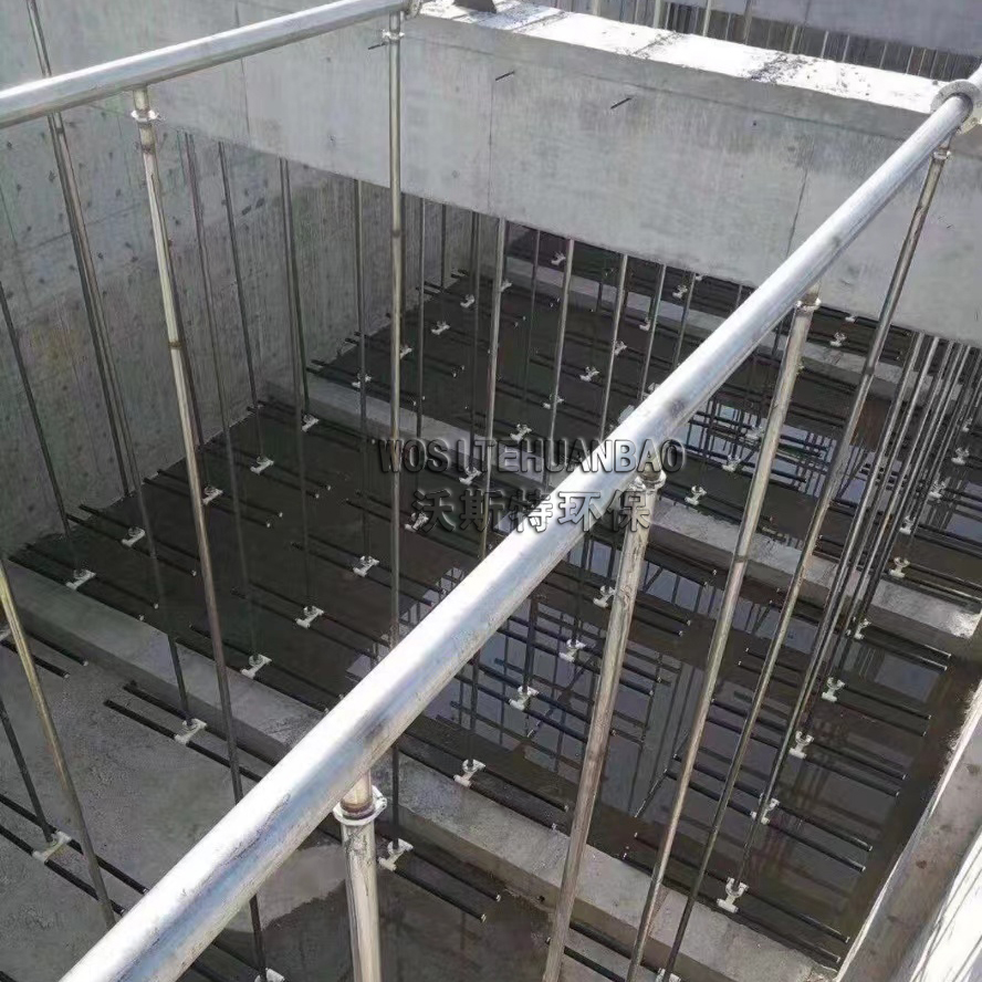 曝气器安装与曝气池底部由一根主管与底部支管相连接,管路呈环状布置,通气管有调节支架固定于池底,微孔扩散器安装在通气支管上,可用平板曝气器或者管式曝气器,刚玉曝气器。