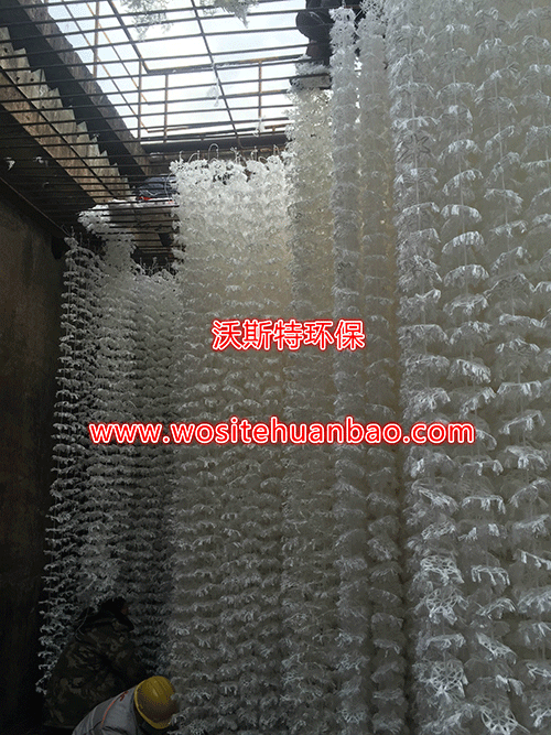 悬挂式填料安装时,把两端分别拴扎在各种类型支架上使用的填料称为悬挂式填料,例如软性填料、半软性填料、组合填料、弹性立体填料、自由摆动填料等。由于其结构简单、造价低、比表面积大,不易堵塞,耐冲击负荷等优点,几乎占领了目前绝大部分的污水生物处理填料市场。但是这些填料最大的问题是填料支架的腐蚀倒塌、填料中心绳的互挠断裂以及无法人池维修造成填料报废。市场上出售的产品如半软性填料的模片厚度,由最初的2mm改为现在的0.34mm,强度弱,挂膜后弯曲下垂,中心绳在挂膜后弹性伸长,使得串片在鼓风吹动下摆动且缠绕在- -起。