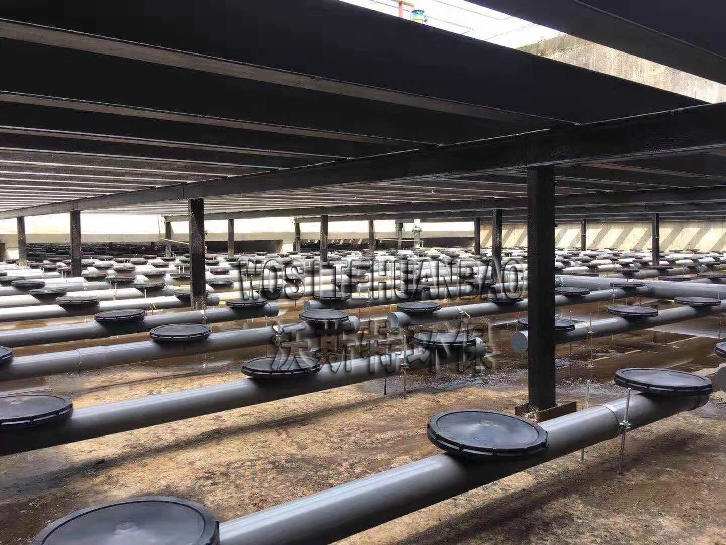 曝气器安装与曝气池底部由一根主管与底部支管相连接,管路呈环状布置,通气管有调节支架固定于池底,微孔扩散器安装在通气支管上,可用平板曝气器或者管式曝气器,刚玉曝气器。
